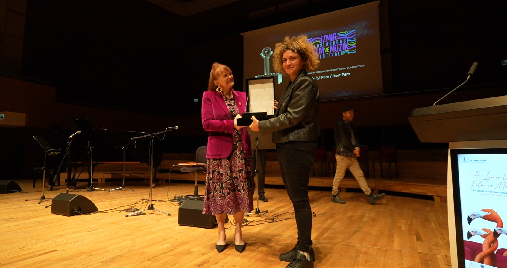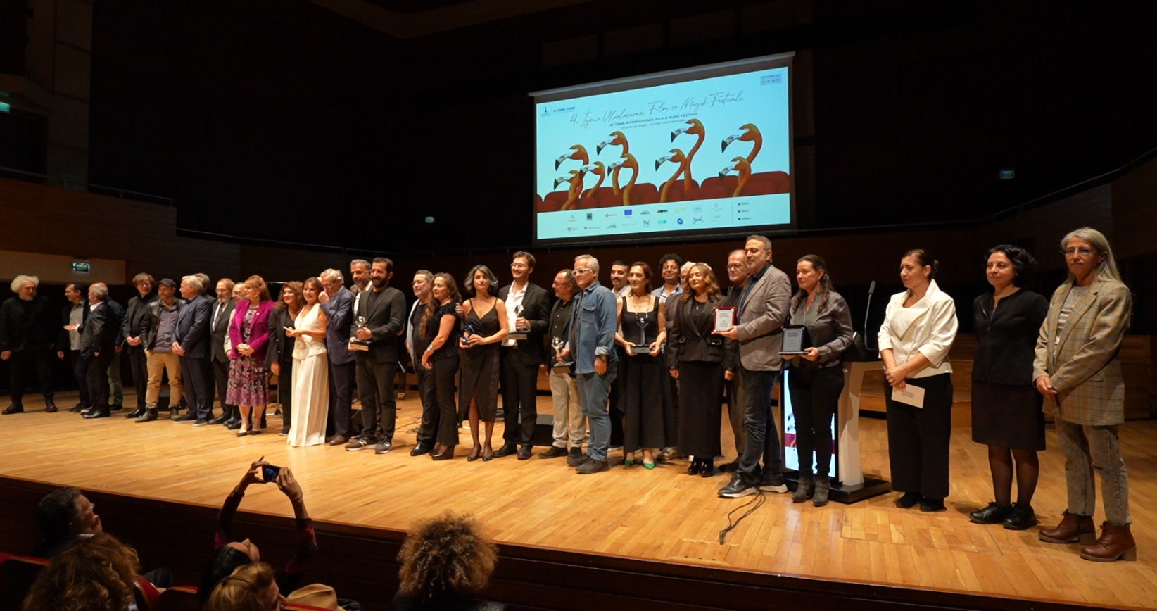 At IstinyePark Renk Cinemas and Institut français Izmir, films were screened in the National and International Competition, Special Screenings, Honor Awards, Intercultural Arts Achievement Awards, Homage to Masters, Memories, Portraits from Our Cinema, Directors Without Borders, Three Films from Three Continents, Music and Life, and Children of All Ages sections. Discussions with film teams were held. At Izmir Art, the exhibition "Artist Portraits by Necati Abacı" met art lovers, while at Izmir Culture and Art Factory, after screenings of Nedim Otyam's 1952 film "Toprak" and Nil Gür Pınar's documentary "Nedim Otyam," a panel titled "Pioneers of Our Cinema Music" was held. On November 3rd, the closing night of the festival, Kristal Flamingo Awards were presented at the Ahmet Adnan Saygun Art Center hosted by Şenay Gürler. The evening featured a mini-concert of unforgettable film music by Süheyla Çolak, Erol Mecihan, Emrah Sayın, and Yunus Boyraz from the Izmir Big Band.